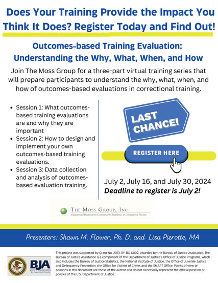 The “Outcomes-based Training Evaluation,” a three-part virtual training series, will prepare participants to understand the why, what, when, and how of outcomes-based evaluations in correctional training. The first module will discuss what outcomes- based training evaluations are and why they are important. The second module will discuss how to design and implement your own outcomes-based training evaluations. Finally, the third module will discuss data collection and analysis of outcomes-based evaluation training.
