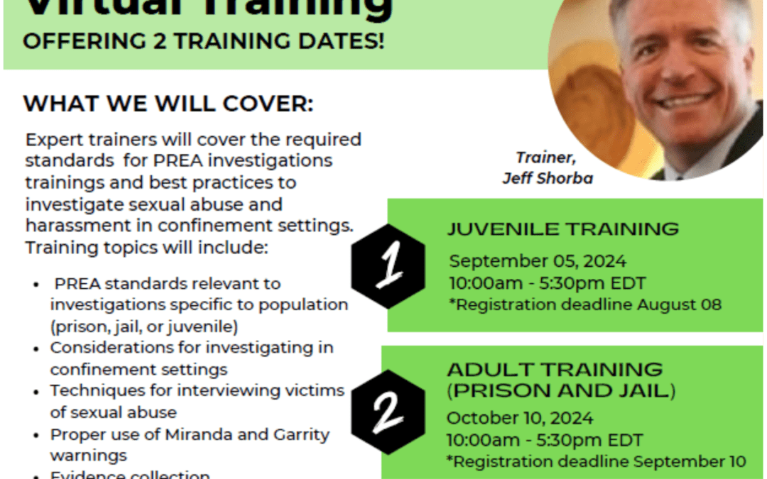 Expert trainers will cover the required standards for PREA investigations trainings and best practices to investigate sexual abuse and harassment in confinement settings.